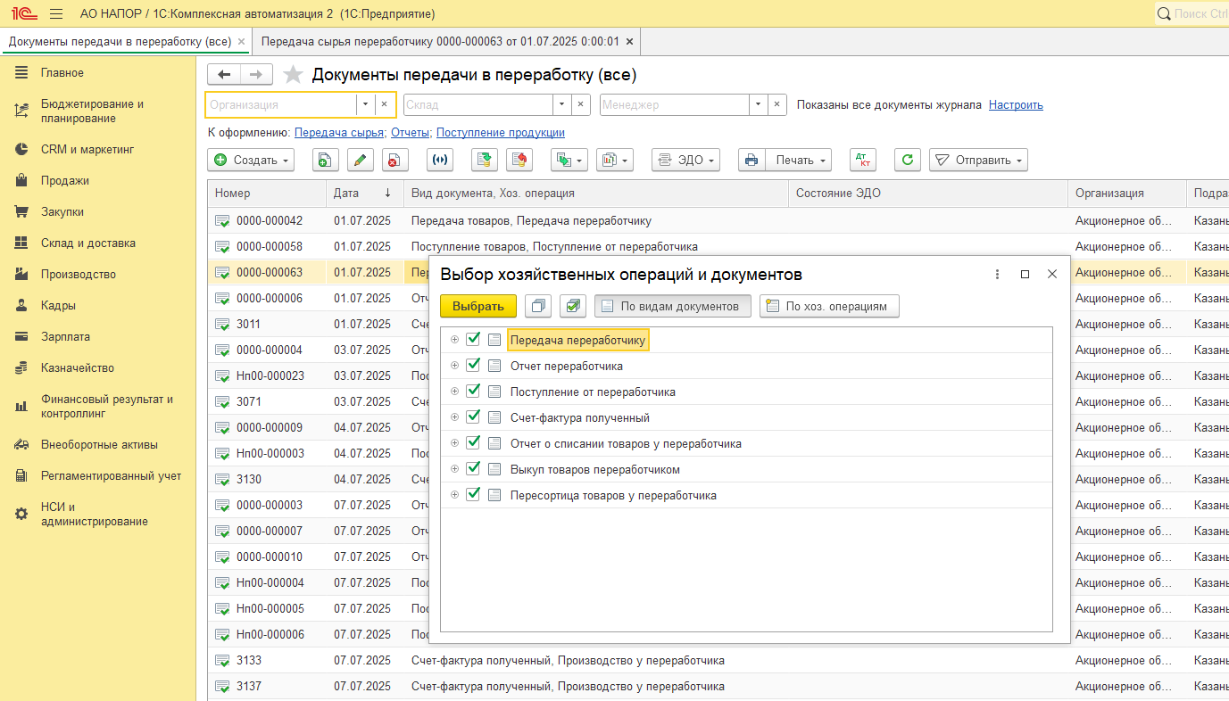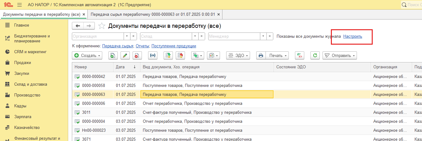 Все документы передачи в переработку можно посмотреть в журнале документов передачи в переработку в меню Производство - Документы передачи в переработку: