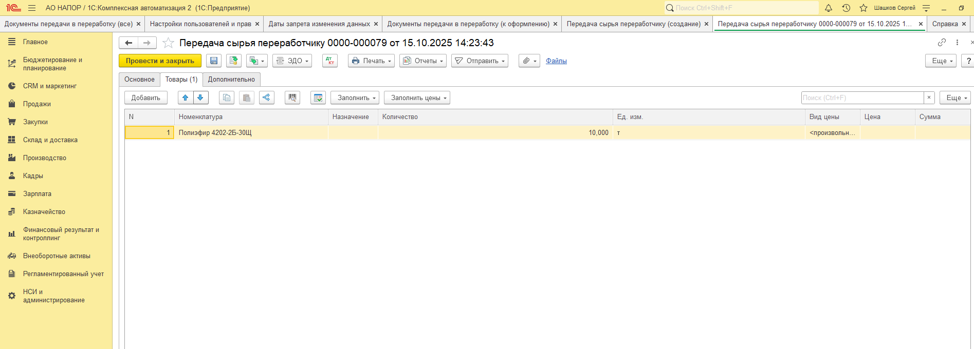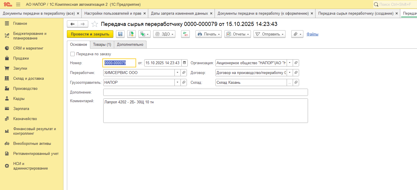 - Договор - Цель договора должна быть "Передача в переработку".