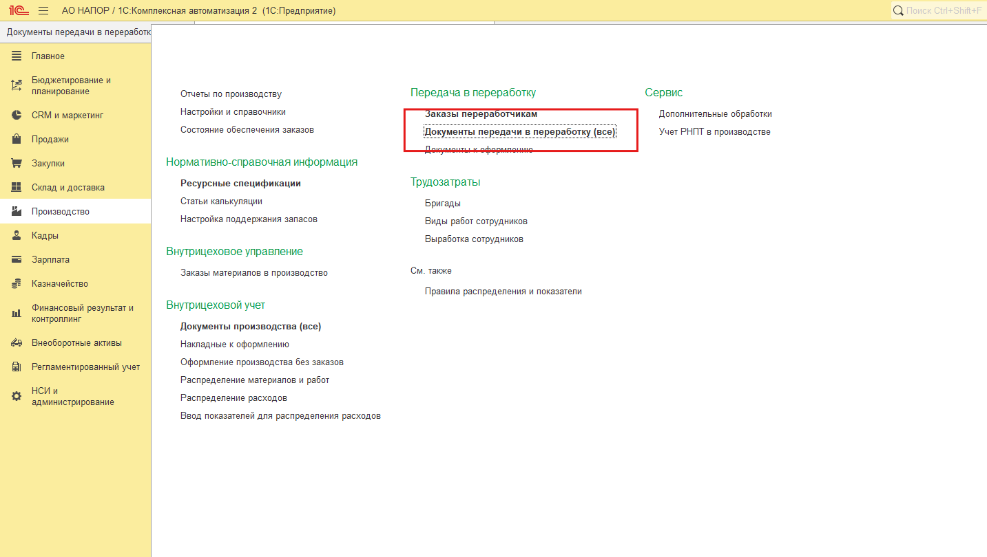 2. С помощью рабочего места "Документы к оформлению". В меню Производство - Передача в переработку - Документы к оформлению