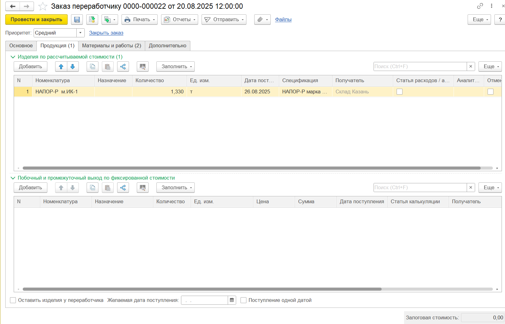 Документ предназначен для регистрации заказов в стороннюю организацию (именуемую Переработчиком), на оказание услуг по переработке переданного ему сырья и материалов, и выпуске готовой продукции (полуфабрикатов) и работ.