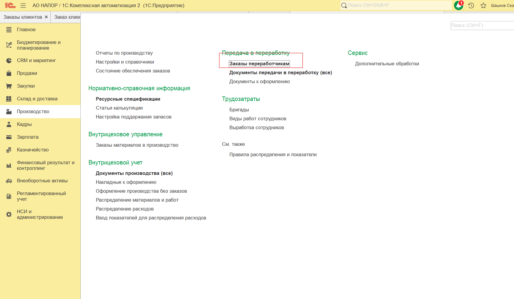 Для создания документа "Заказ переработчику" перейдите в раздел "Производство" - "Передача в обработку" и выберите пункт "Заказы переработчикам":