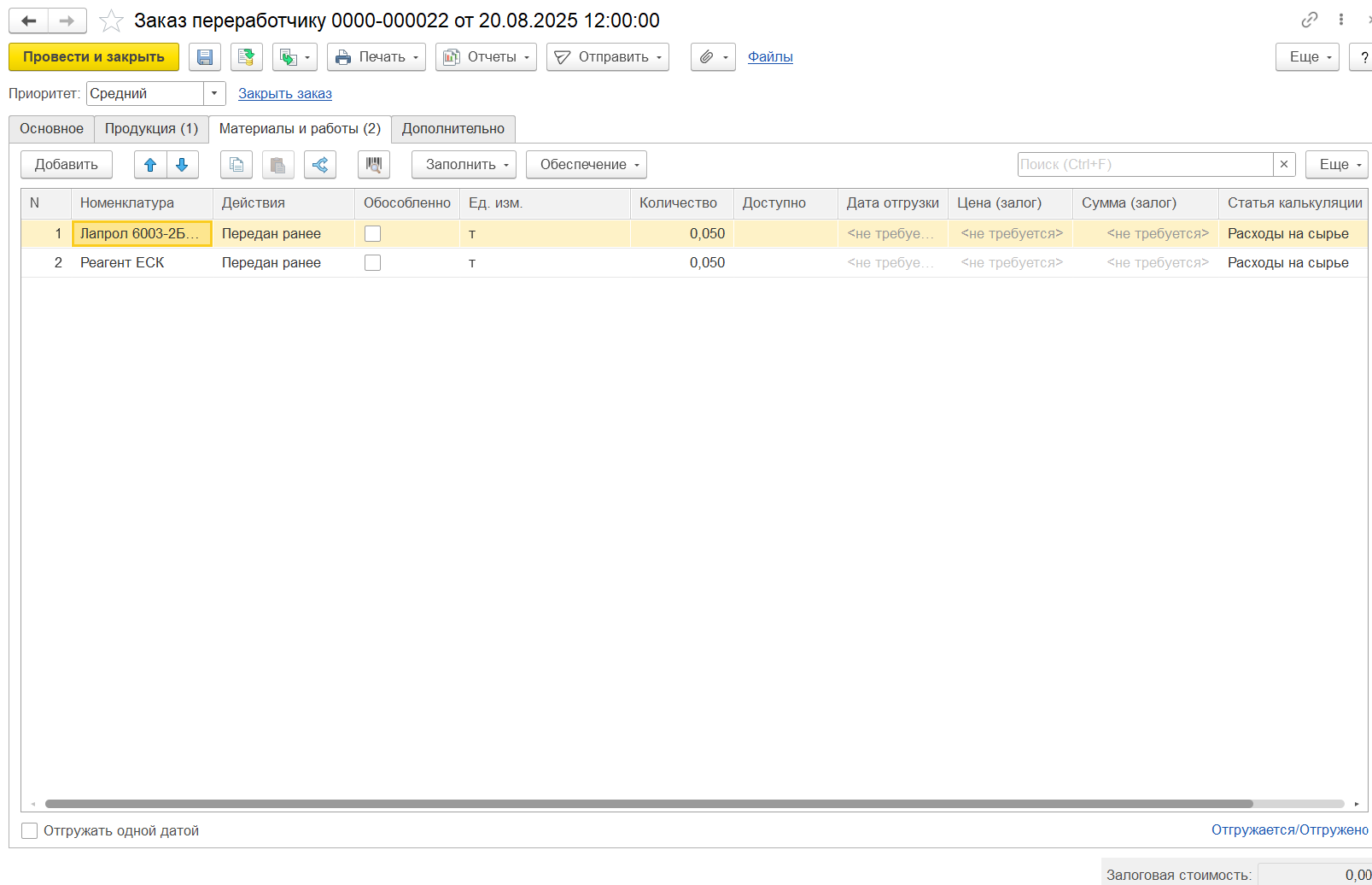 В табличной части указывается сырье, которое наша организация готова предоставить переработчику. По кнопке "Обеспечение" - "Передан ранее" устанавливается признак того, что материалы необходимо списать у переработчика. По команде "Обеспечение" - "Отгрузить" мы устанавливаем признак, что необходимо переместить товар с нашего склада переработчику и в дальшейшем на основании Заказа переработчику создать документ "Передача сырья переработчику".
