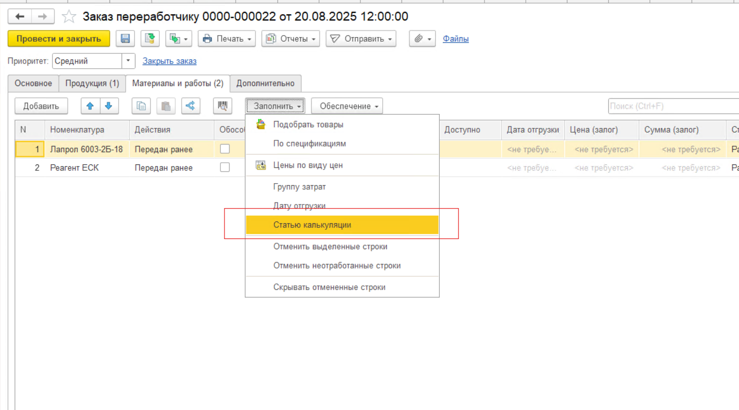 По кнопке "Заполнить" в командной панели - Статью калькуляции заполняем статью "Расходы на сырье"