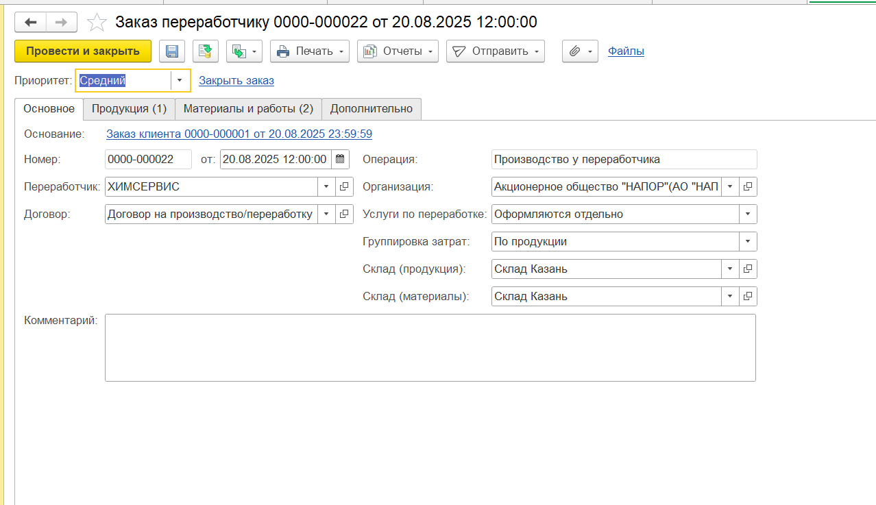 Заполняется автоматически, если документ Заказ переработчику заполняется "на основании" Заказа клиента.